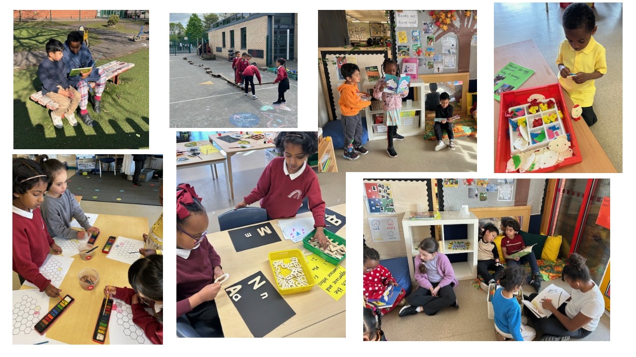 Children develop their literacy skills by the imitation of stories that they learn using actions and story mapping techniques. They then move onto innovation of these well-known stories by including their own ideas. Literacy and Phonics opportunities are also promoted in many of the continuous provision activities available to children during the week. The Early Years uses high quality texts as a basis for topic planning and usually start with an exciting hook to engage children in both the topic and the book.